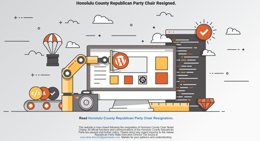 Visitors to the Oahu GOP’s official website got to see this page (shown above) which boldly asserts that Chang’s departure renders the work of the Honolulu county party “paused until further notice”. Moreover, both the new web page and an auto-reply email sent by HIRA News to OahuGOP@gmail.com stated that “official county business is on hold”. It also contained the directive that urgent inquiries and urgent matters are now being handled by the state party’s highly compensated ($6,700/month) executive director Ronette “Ola” Souza. Ms. Souza should have time to assist the defunct county party since it’s not known if she’s actually done anything to earn her salary for the past four months; not even updating the party’s own outdated state GOP website which contains names of party officers who have long been gone since the mass exodus began with Art Hannemann’s departure (still listed as state chairman).