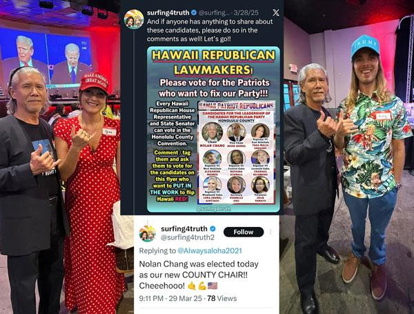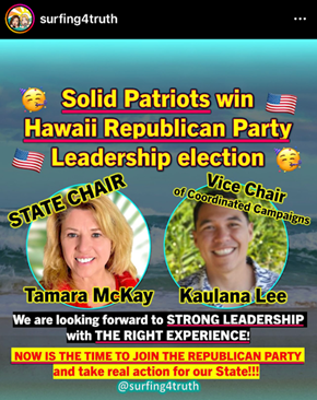 After Nolan Chang was backed for the top jobs by BJ Penn’s dubious campaign team Andy Crossland and Lynn Surayan (pictured above and below) over at Surfing 4 Truth – as well as failed Hawaii GOP chair Tamara McKay and other ‘iffy’ endorsers – Chang led an internal campaign in recent weeks which demanded financial transparency, adherence to party rules, and an end to the turf warfare which has plagued the troubled Hawaii chapter of the Republican National Committee for decades.