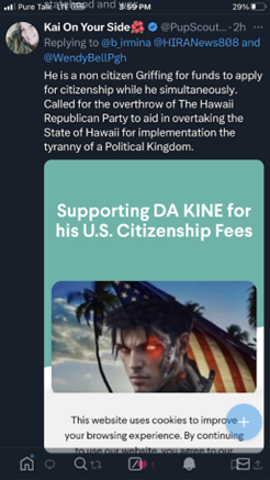 HIRA News’ Kai Lorinc worked to expose illegal fundraising for a noncitizen campaigning to “overthrow the Hawaii Republican Party to aid in overtaking the State of Hawaii for implementation of a Political Kingdom”
