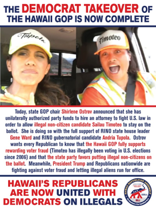 Sadly, Shirlene Ostrov did the same thing in 2018, using party resources to assist an illegal noncitizen (who had already voted illegally in Hawaii elections) to run for state house until HIRA worked with state elections authorities to have that illegal candidate hoping to replace corrupt liberal gubernatorial aspirant Andria Tupola in the State House removed from the ballot. Chang’s associates also tried (with some success) to install anti-American activists into party leadership posts across the state in furtherance of their ‘statehood denier’ agenda. Wait until Donald Trump hears about this treachery!